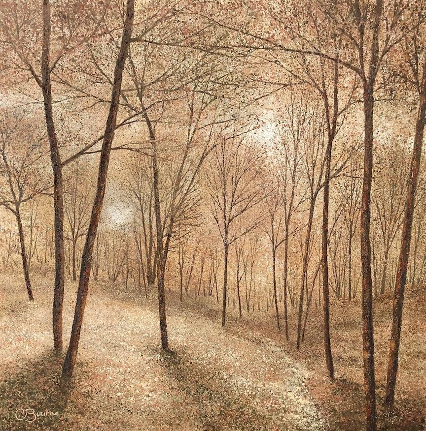 Yearning to return to the great outdoors, Chris relocated to Surrey in recent years where he resumed work as a full time artist. He now spends much of his time rambling amongst the hills, always accompanied by his sketchbook. Criss- crossing the local footpaths and strolling through the fields, the artist uses his expeditions to record light and colour, his studies forming the bones of his intricate paintings.
