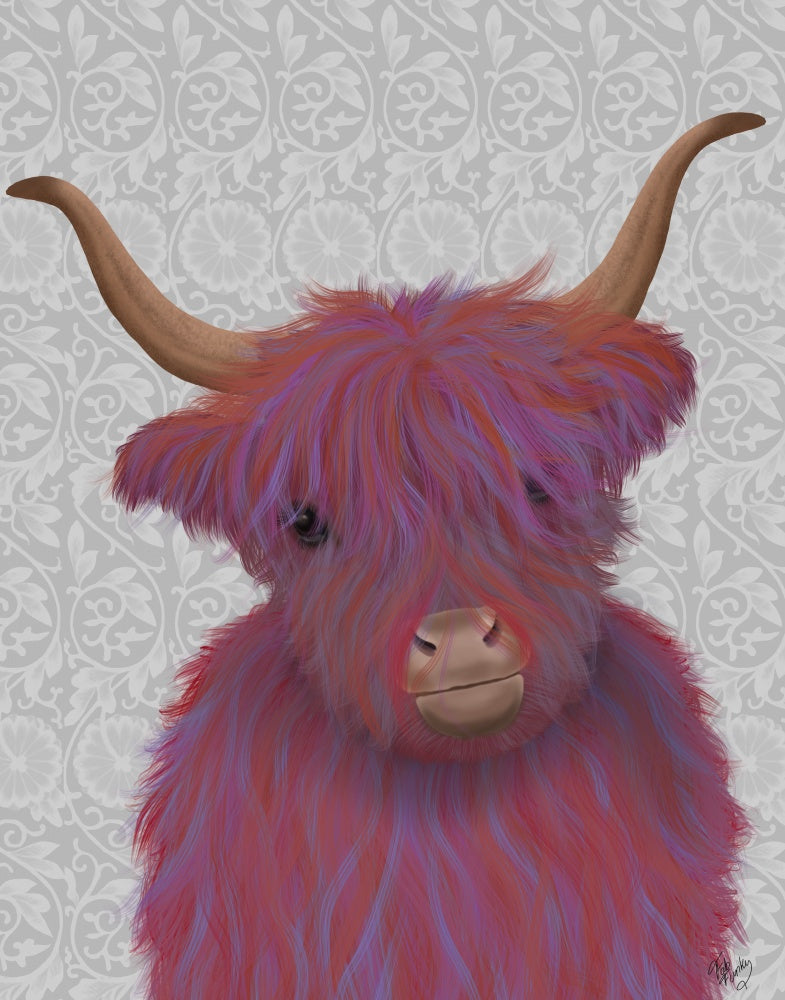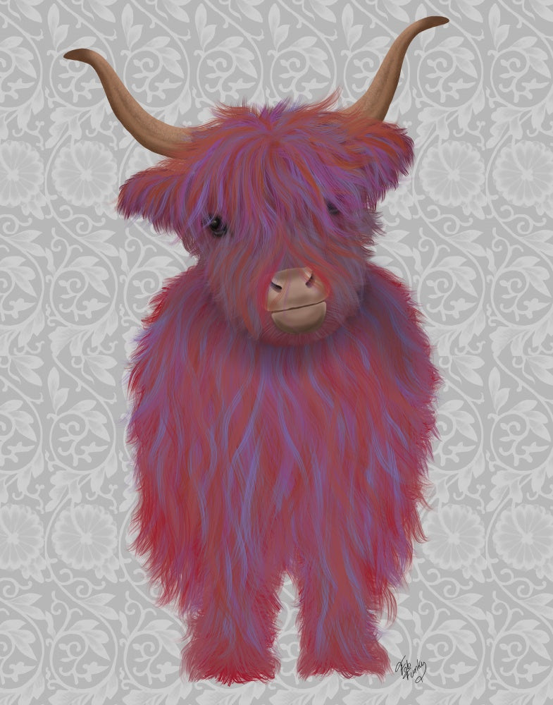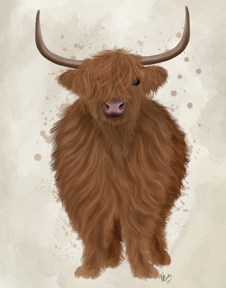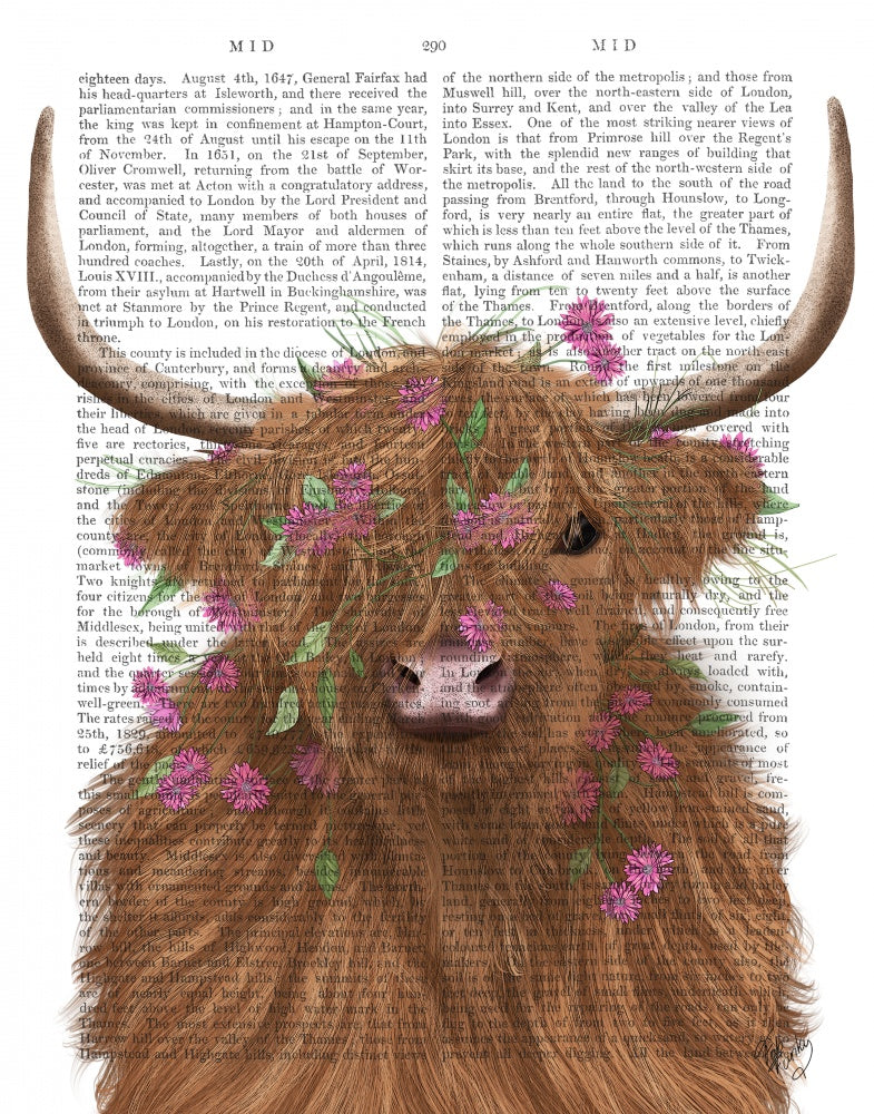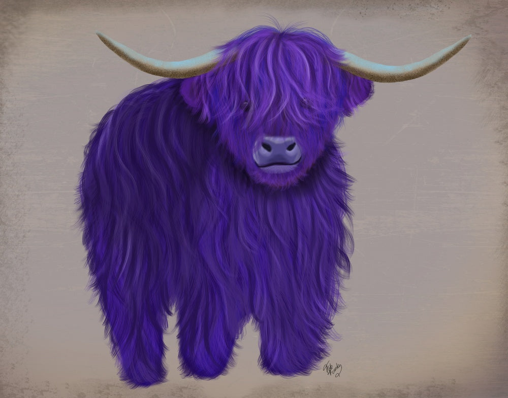 The highland cow was bred in Scotland. Prized for its superior milk, the gentle giants also worked ploughing the fields and became a mainstay on Scottish farms. Beyond the practical role of the highland cow, they also hold spiritual significance for many. Symbolically, the highland cow may be seen to represent resilience. They are all a symbol of good luck and good fortune. Above all, the highland cow serves as a reminder to slow down and take the time to appreciate nature's bounty. In contemporary art, the highland cow is often painted with spring flowers or other vibrant colours, presenting them as a lively and charismatic that is sure to bring a smile to your face.