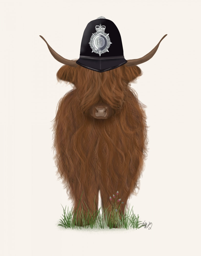 The distinct style and colour pallet of Ben Jeffrey’s work sets the highland cow in all its natural majesty, with earthy tones and a light touch. By contrast, the playful prints of Fab Funky are all about bringing out the fun and brightness of the highland cow.