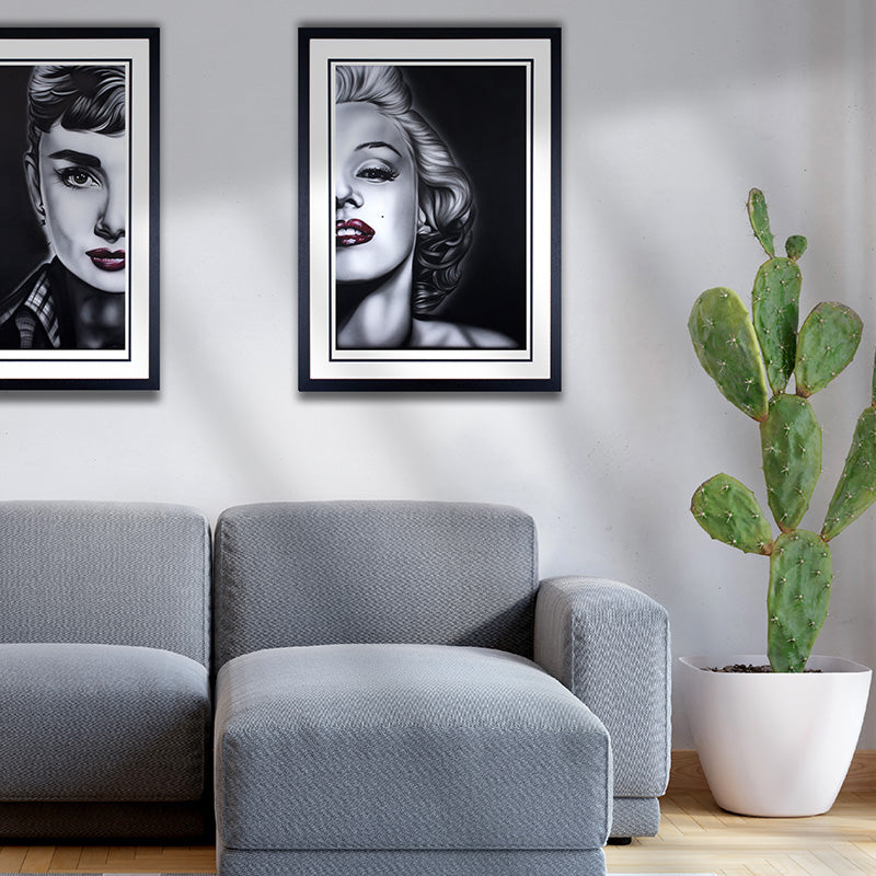 Please refer to the description above. Depending on the artwork a selection of finishes can be made from the colour of the frame to the glass option (where applicable) All sizes for the respective artwork are mentioned in the artworks description.