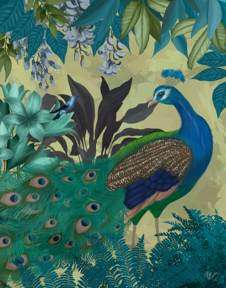 Beyond the symbolism, peacocks are a popular subject for artists as they present a huge number of details and a spectacular array of colours. Their otherworldly characteristics pose a challenge to artists who seek to capture their ethereal and vibrant forms. However, there are many ways an artist may imagine or reimagine the peacock; the creations of Fab Funky bring out a more playful side to the majestic peacock using a simplistic style that allows the distinctive form of the peacock to shine.
