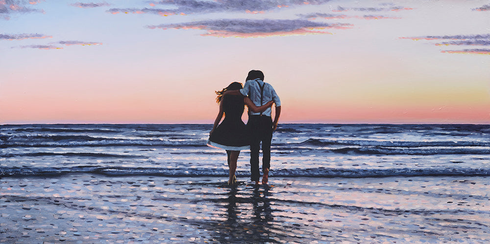 Predominantly an oil painter, Richard paints in a traditional manner. However, inspiration from film, music and the world around him help form the backbone of his compositions. Obsessed with trying to make a painting tell a story, Richard uses fashion and props from bygone eras to help create his tales of love, life and mystery.